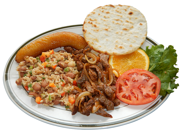 Mixed rice and beans, stewed beef, sweet plantain, corn cake, coffee or chocolate
